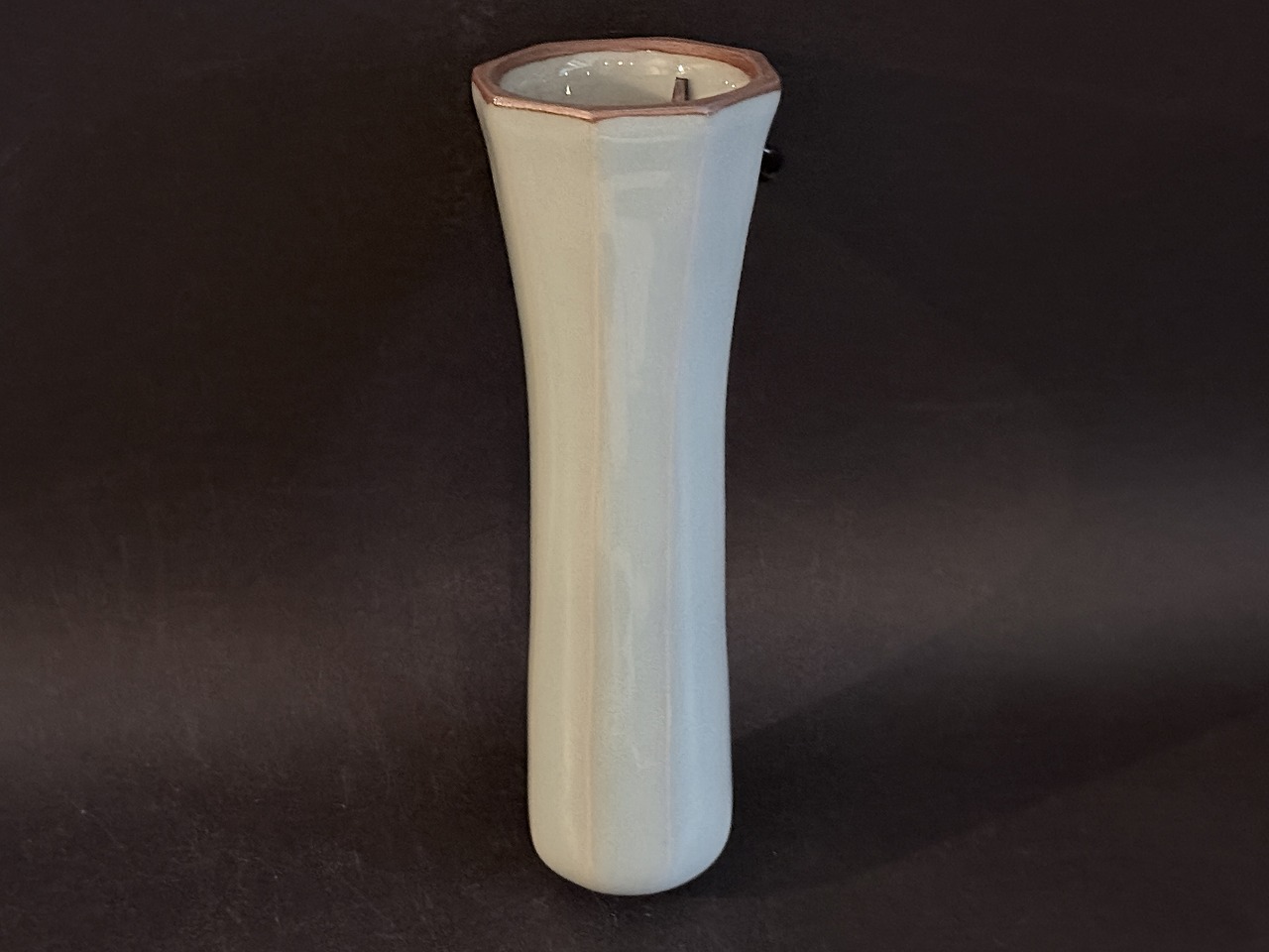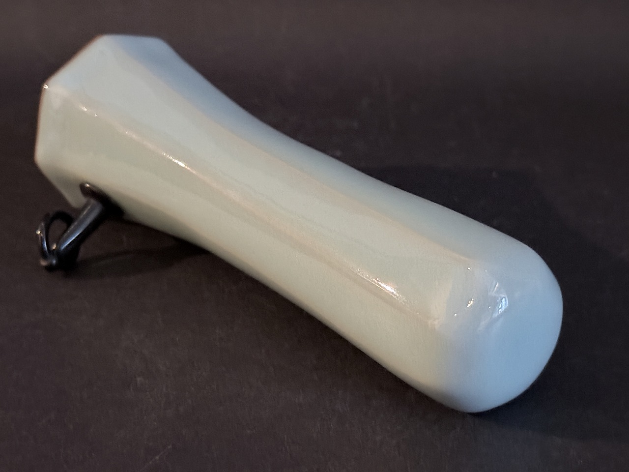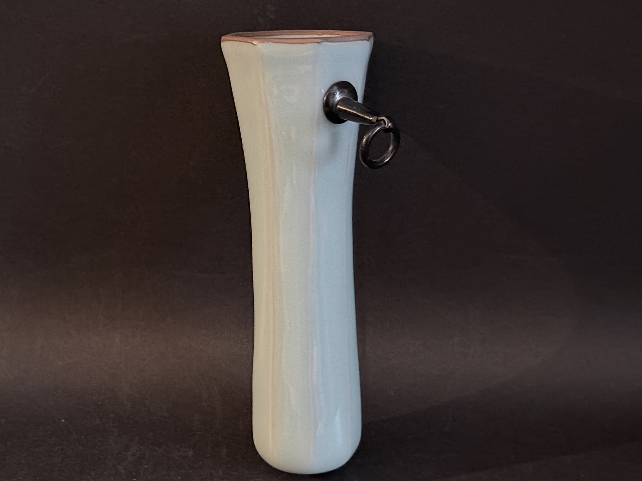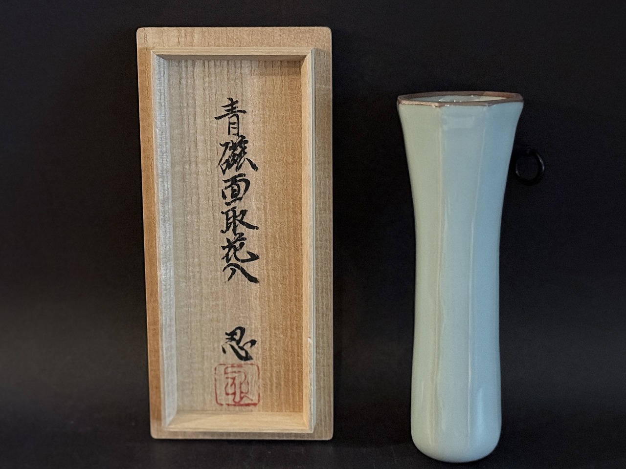 緩やかに面のとられた小ぶりな青磁の掛花入は川瀬忍氏の珍しい作品です