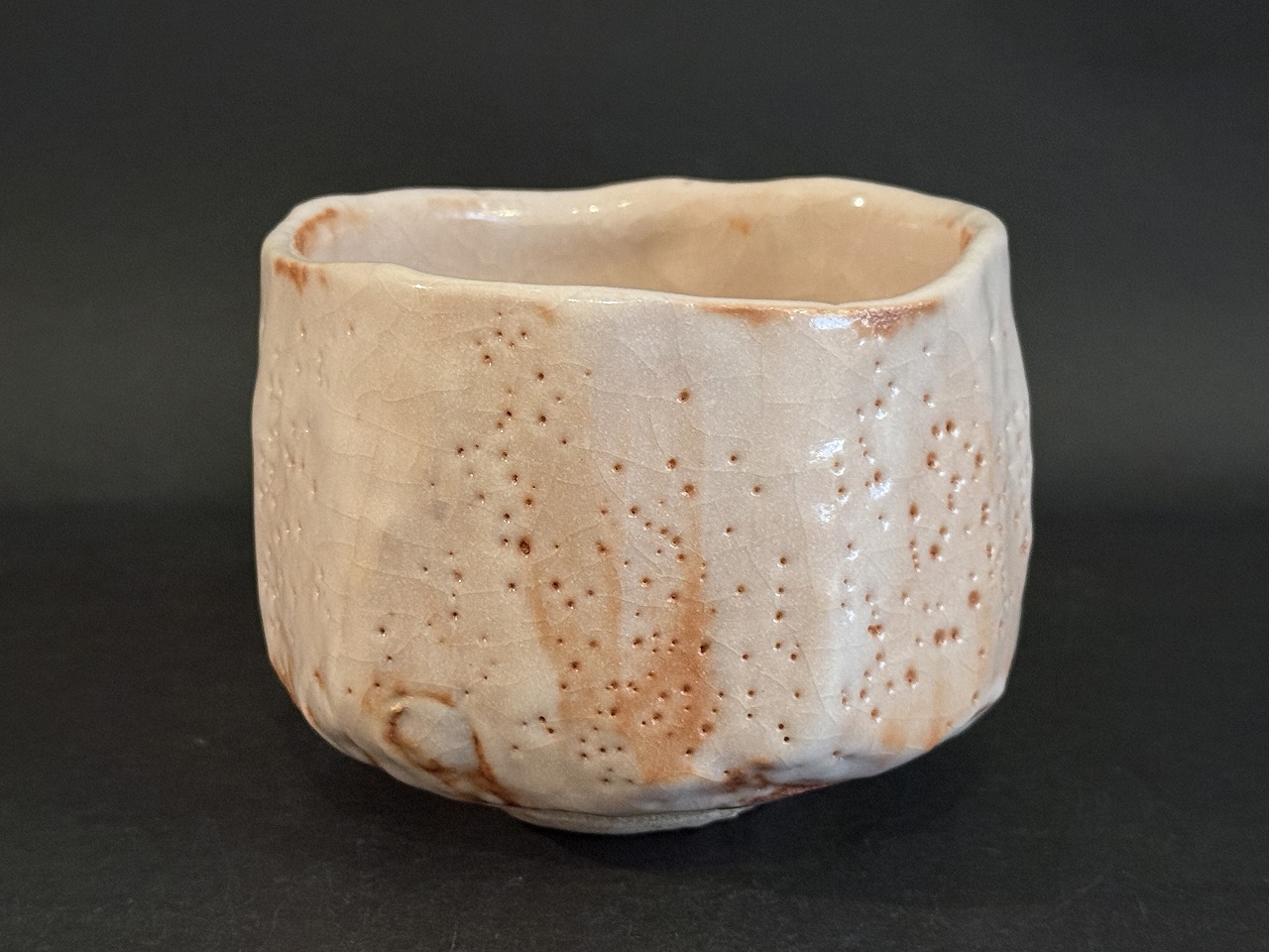 色調の明るい志野茶碗は鈴木氏ならではの高台の無い所謂丸茶碗ですが、胴は全面にタテ箆でそぎ落とし丸みを残しながらもシャープな印象を与える名品です