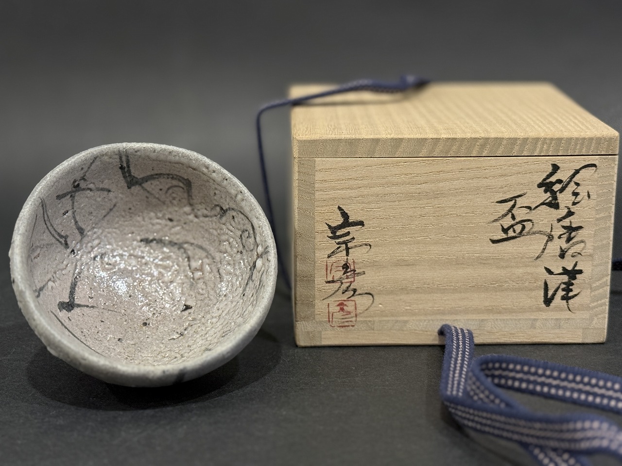 長年古唐津の探求に勤しんでみえる氏の野趣み溢れる絵唐津ぐい吞は平盃に近く、お酒の香りをより一層楽しめる名器です