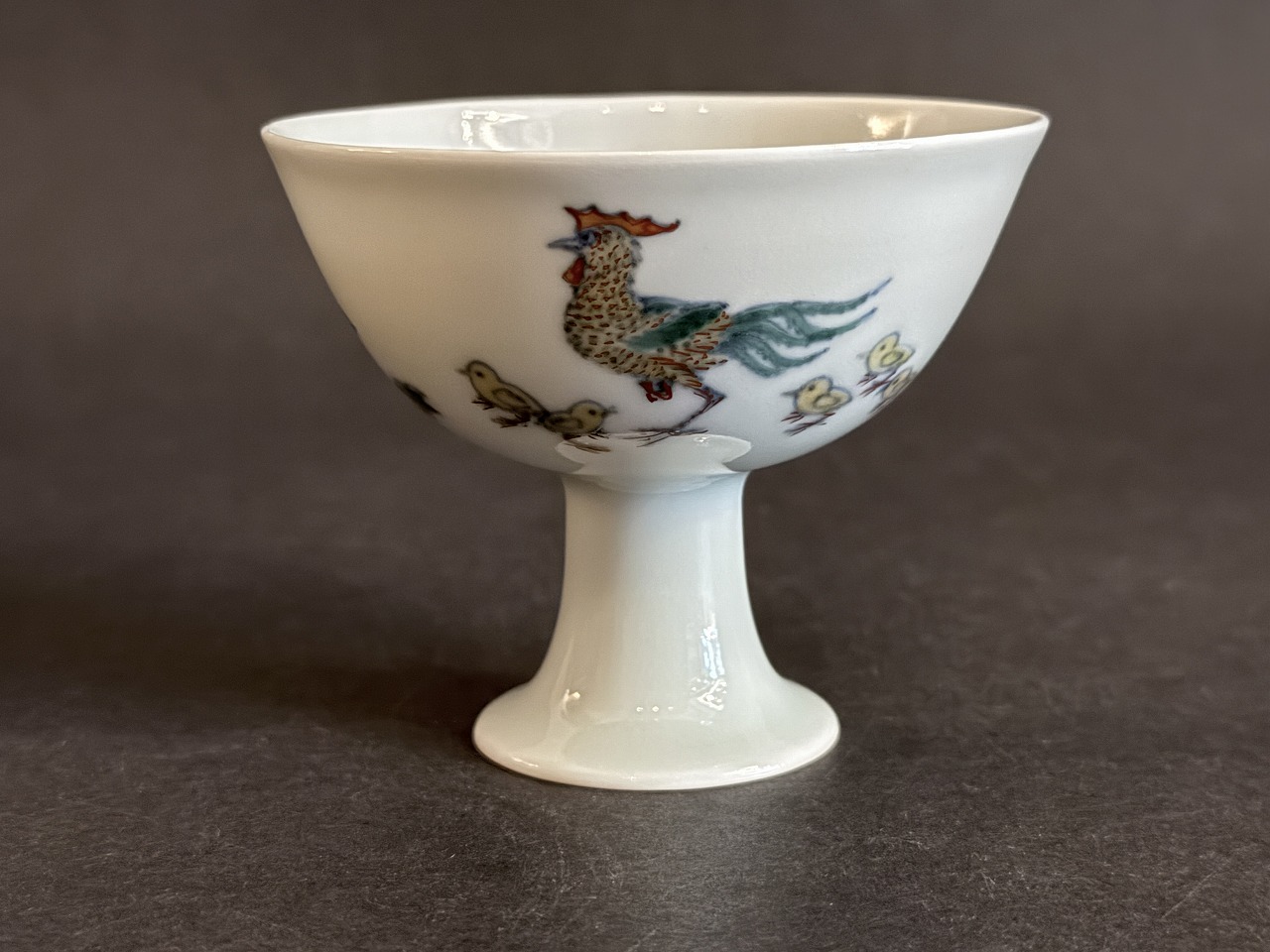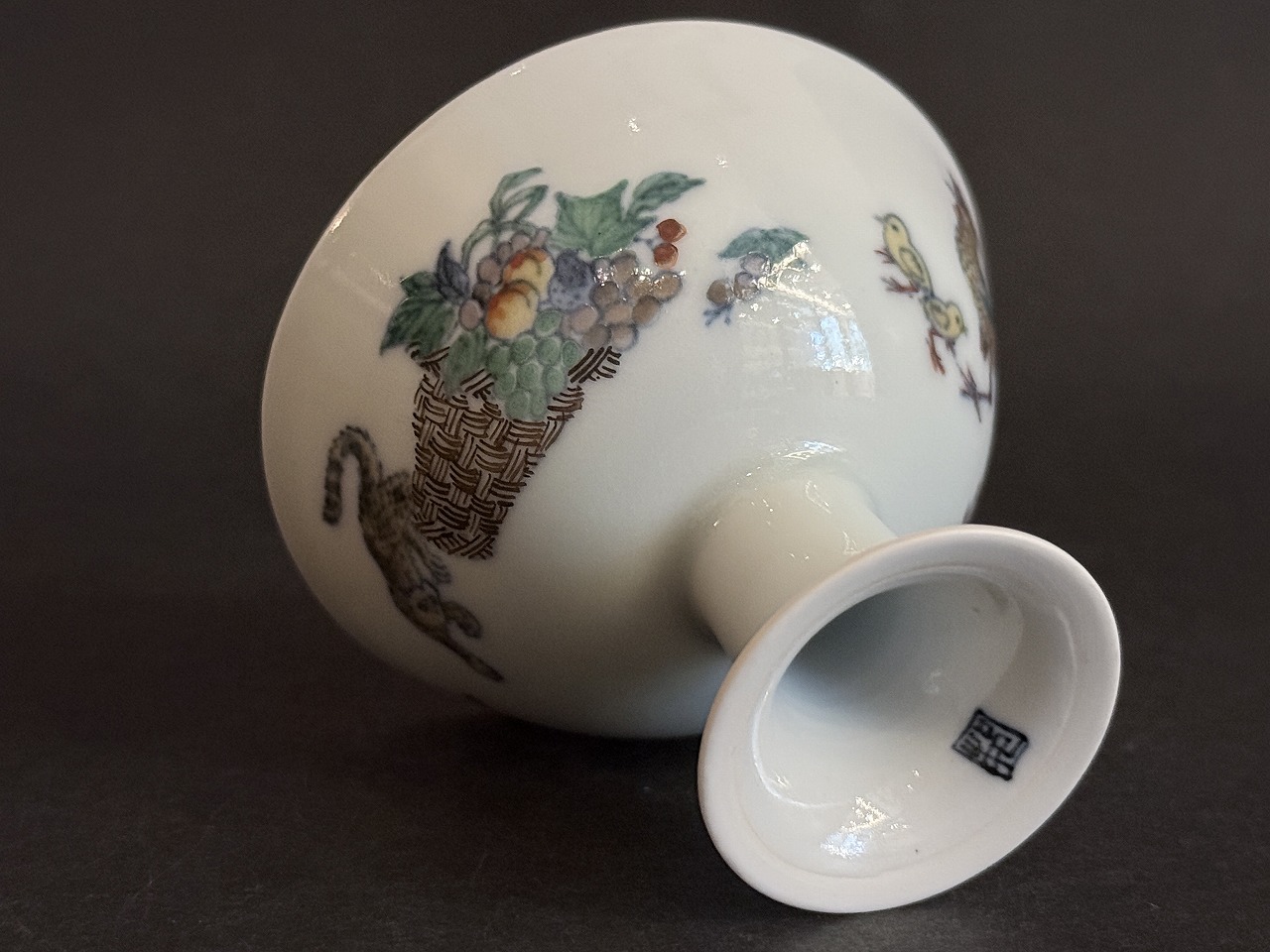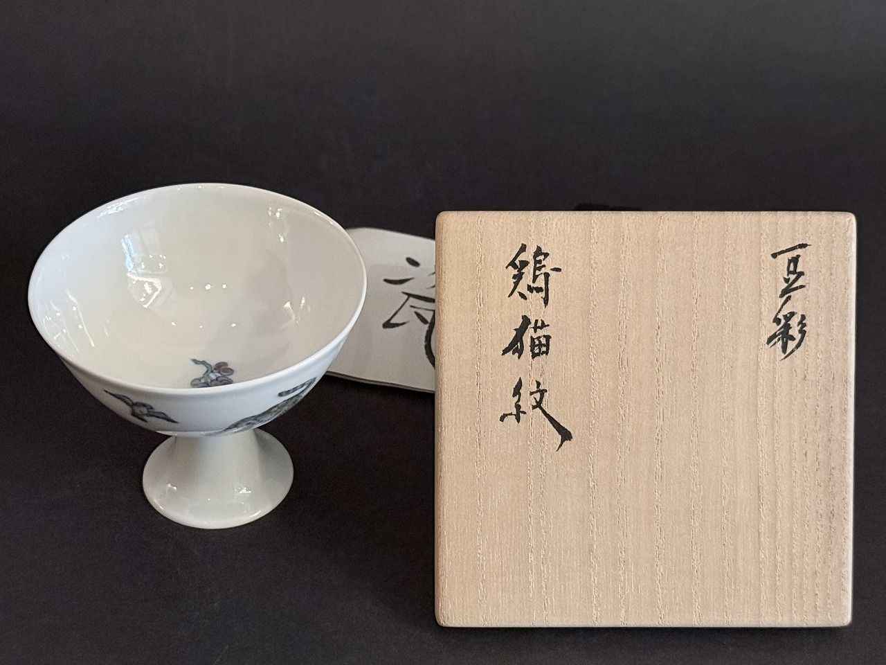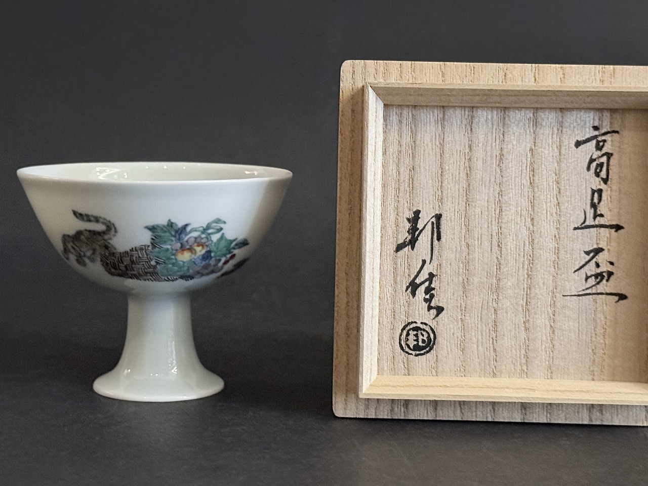 豆彩には定評のある氏の盃には鶏他繊細な絵付けの施された高足で存在感のある酒杯です