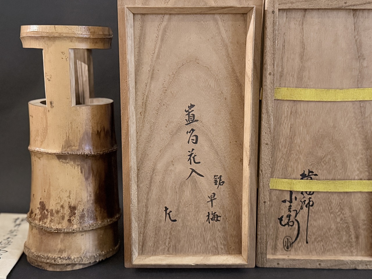 比較的少ない置筒花入は小兵衛下削りの侘びた趣の竹花入で惺斎宗匠の銘「早梅」とございます