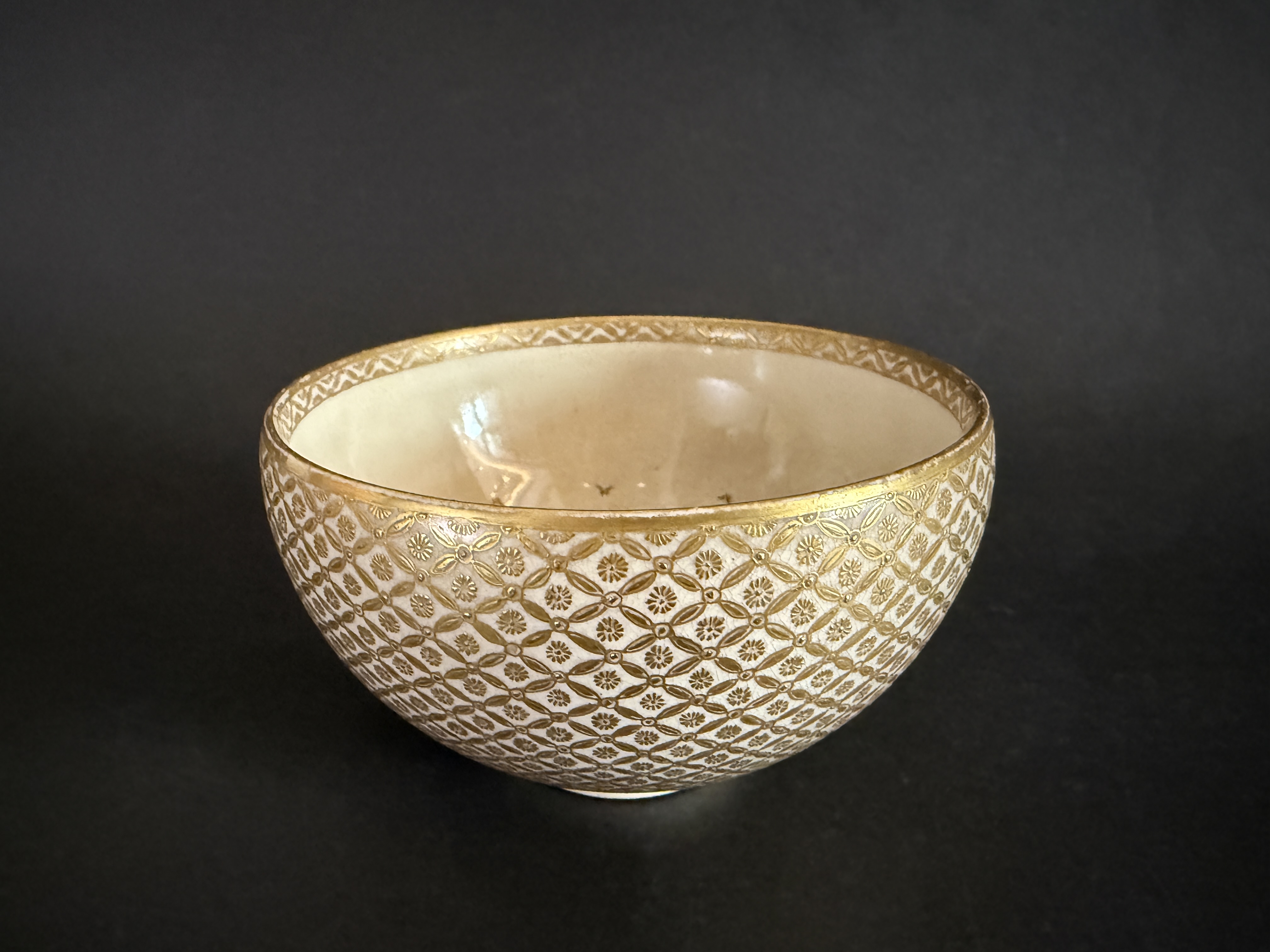 外側全面に七宝菊繋ぎ文を丁寧に施し見込みには無数の蝶が舞い飛ぶ華やかな意匠ながらも古作ならではの品格を持つ名碗です