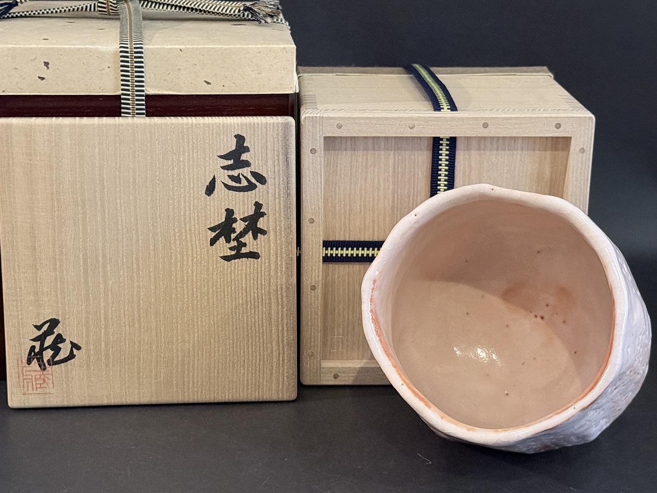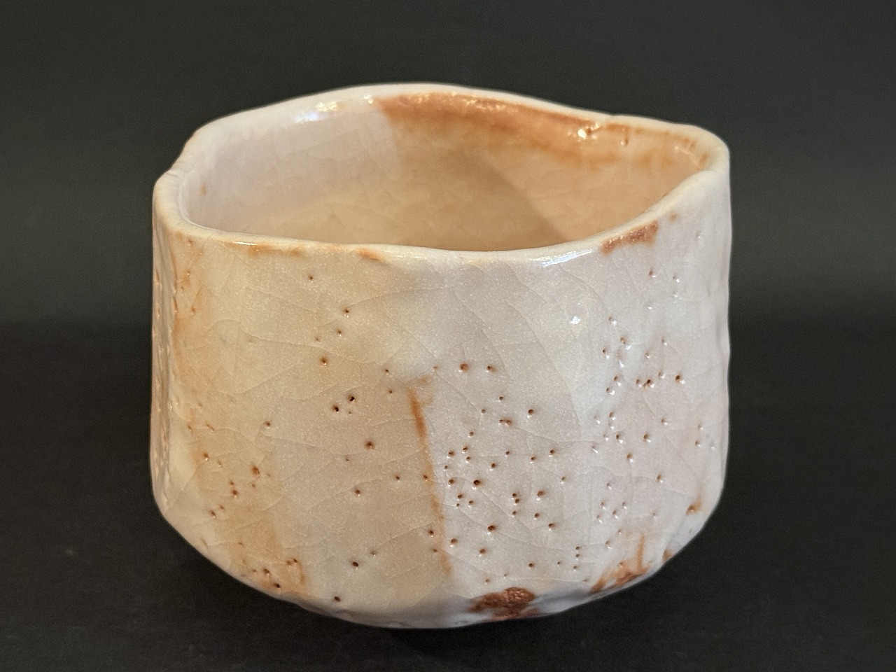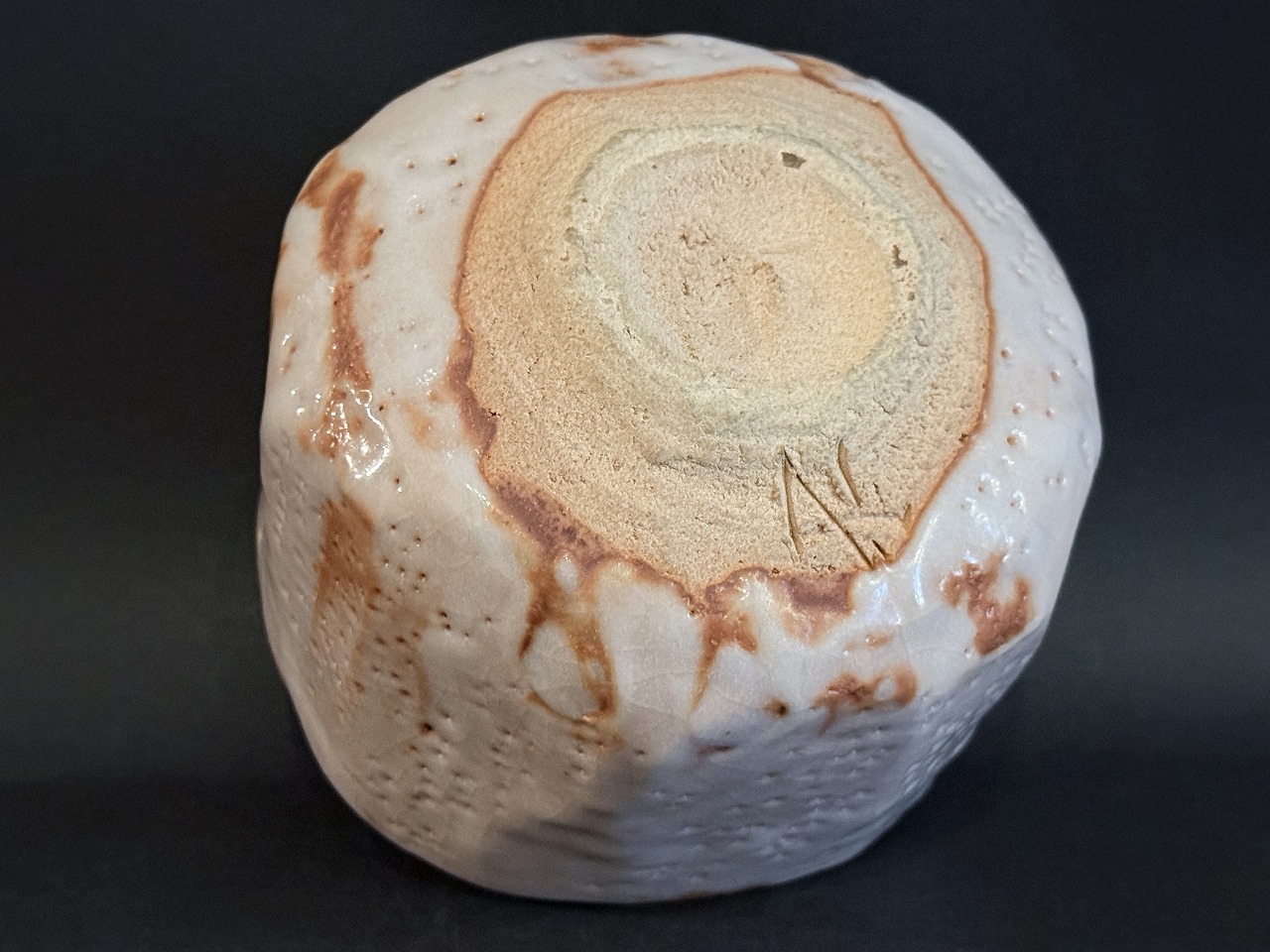 色調の明るい志野茶碗は鈴木氏ならではの高台の無い所謂丸茶碗ですが、胴は全面にタテ箆でそぎ落とし丸みを残しながらもシャープな印象を与える名品です