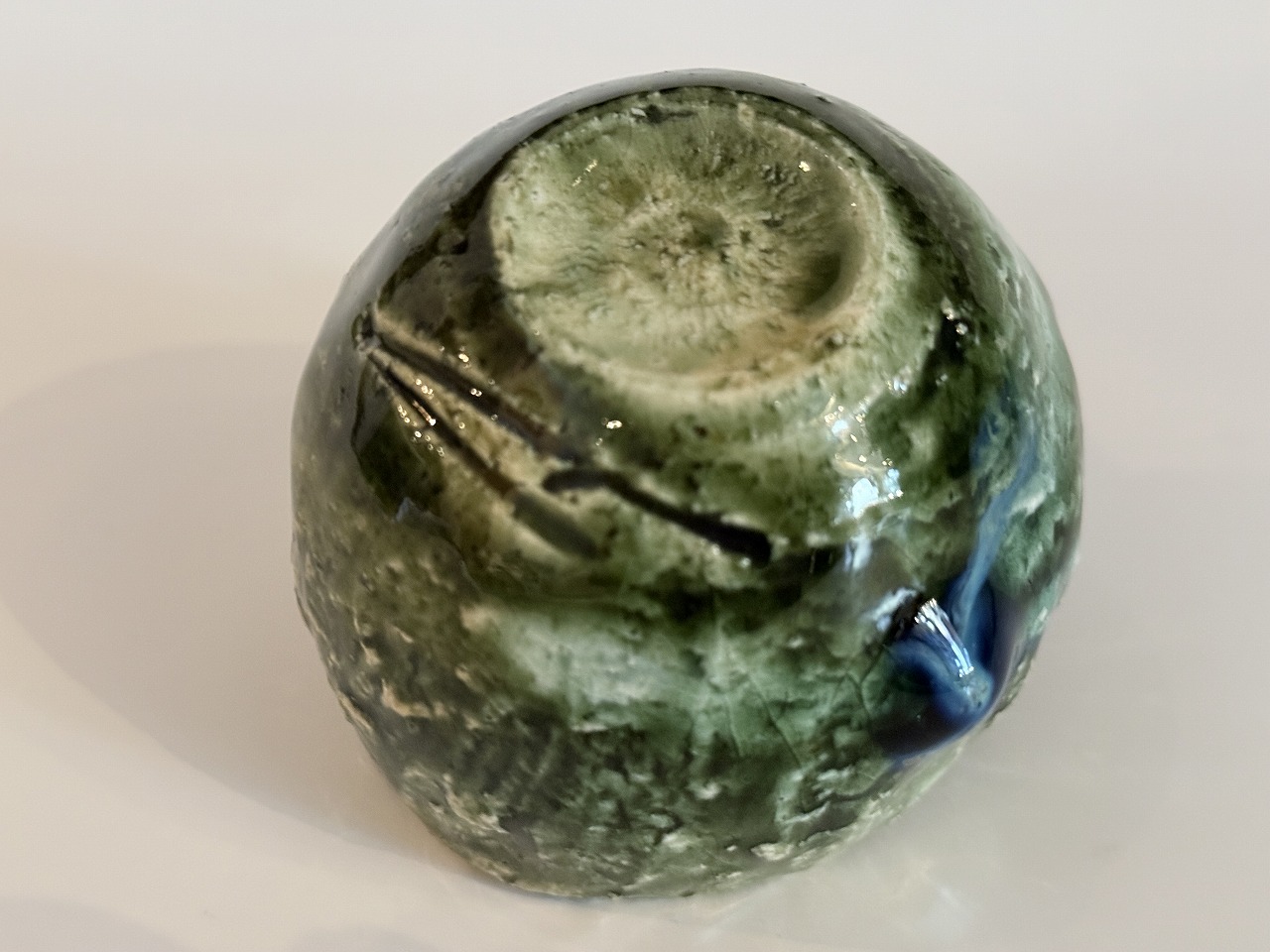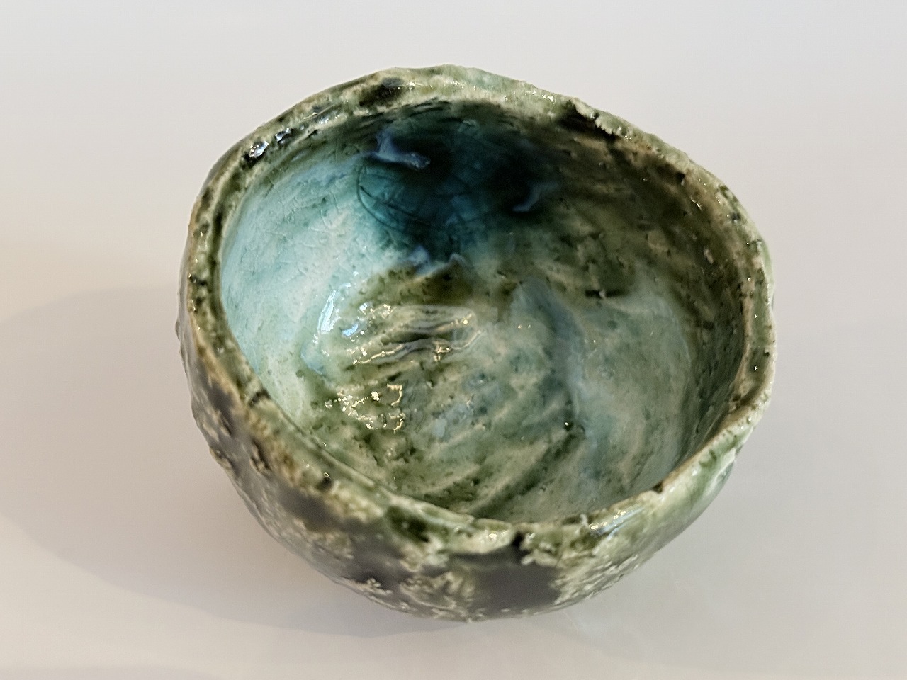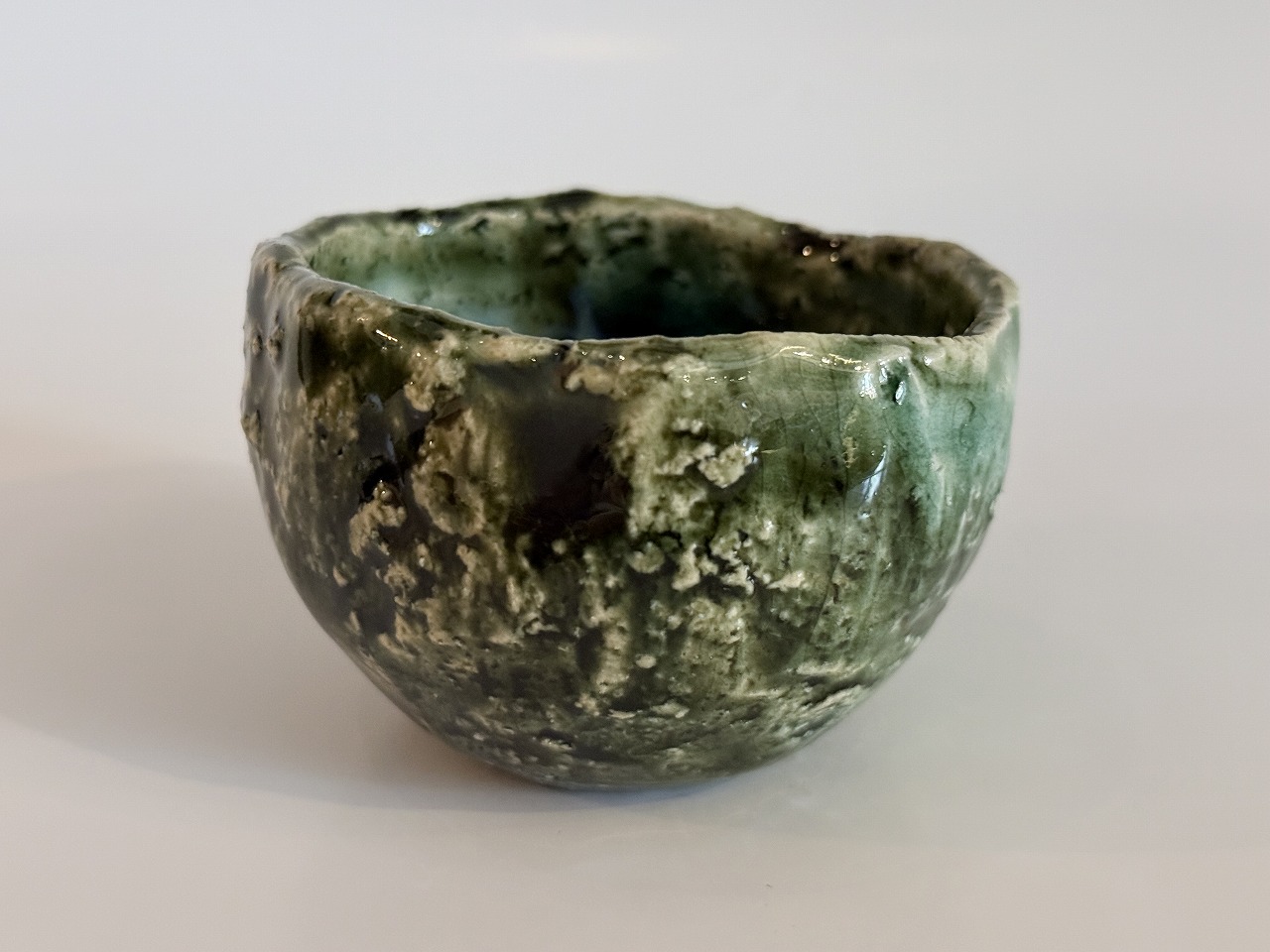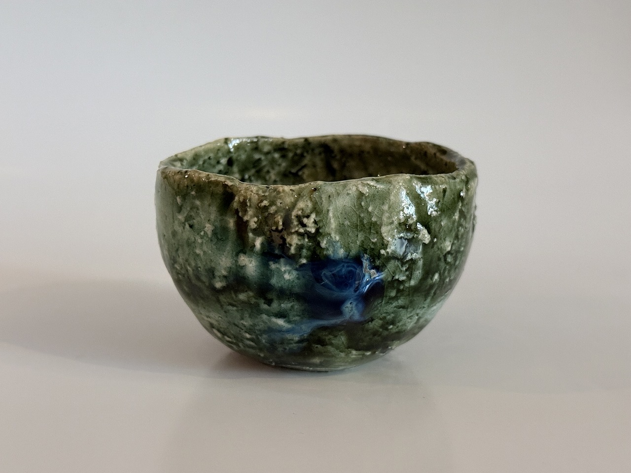 二重に掛けられた釉薬により深みのある色の変化が現れ山口氏ならではの釉の溜まりが玉のようになって見られる総織部ぐい吞の逸品です