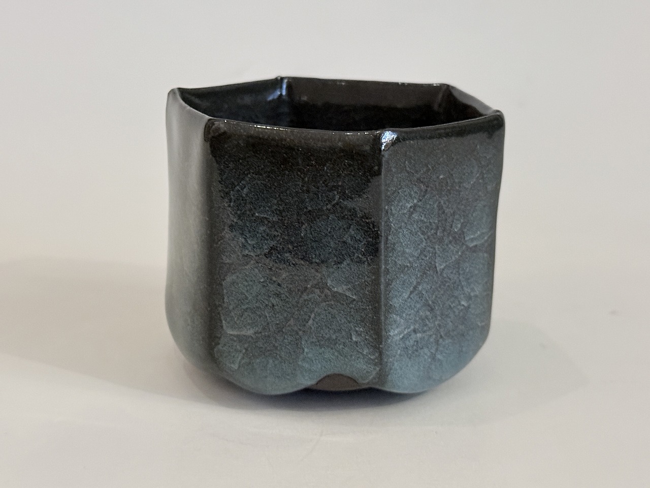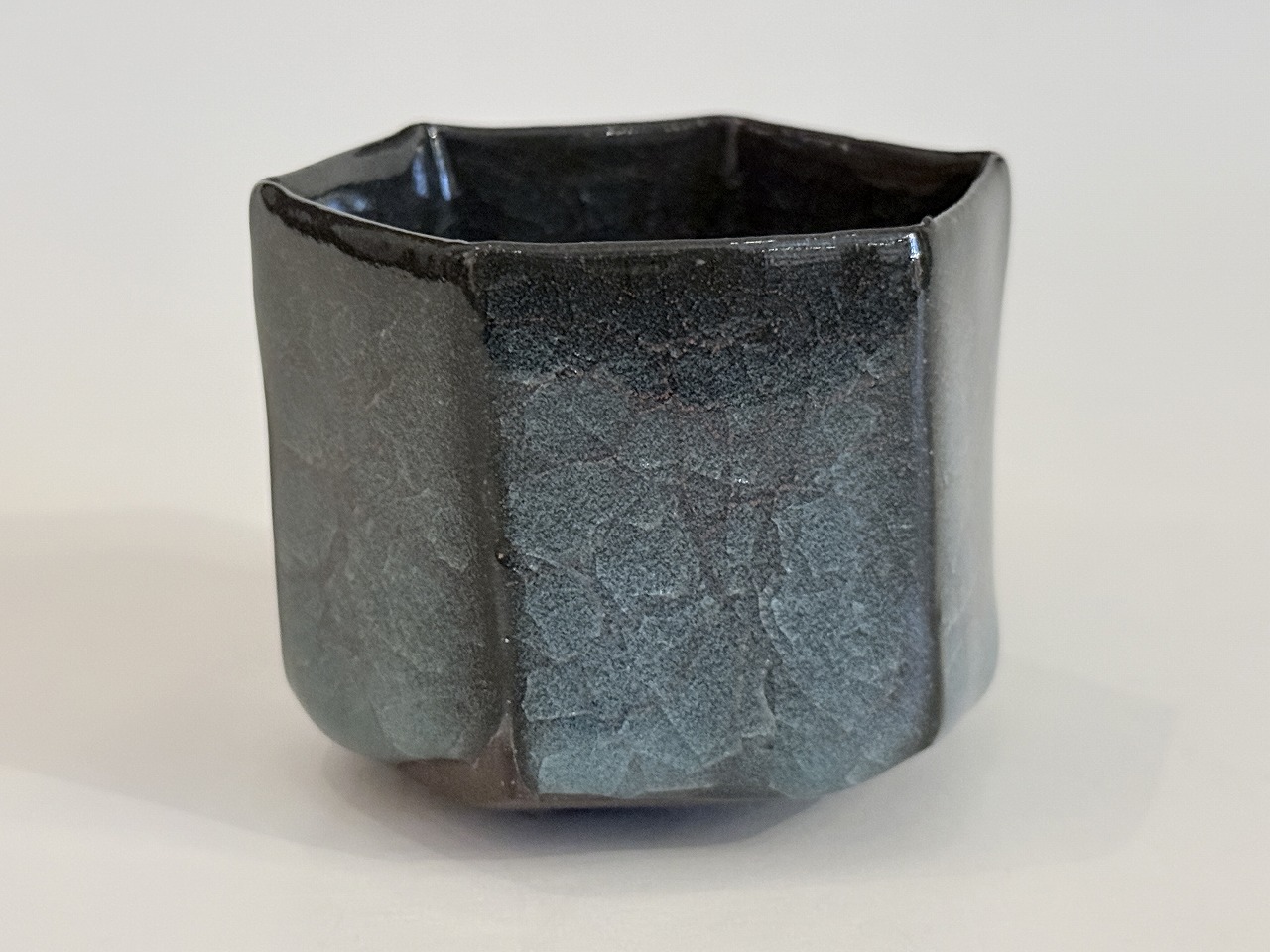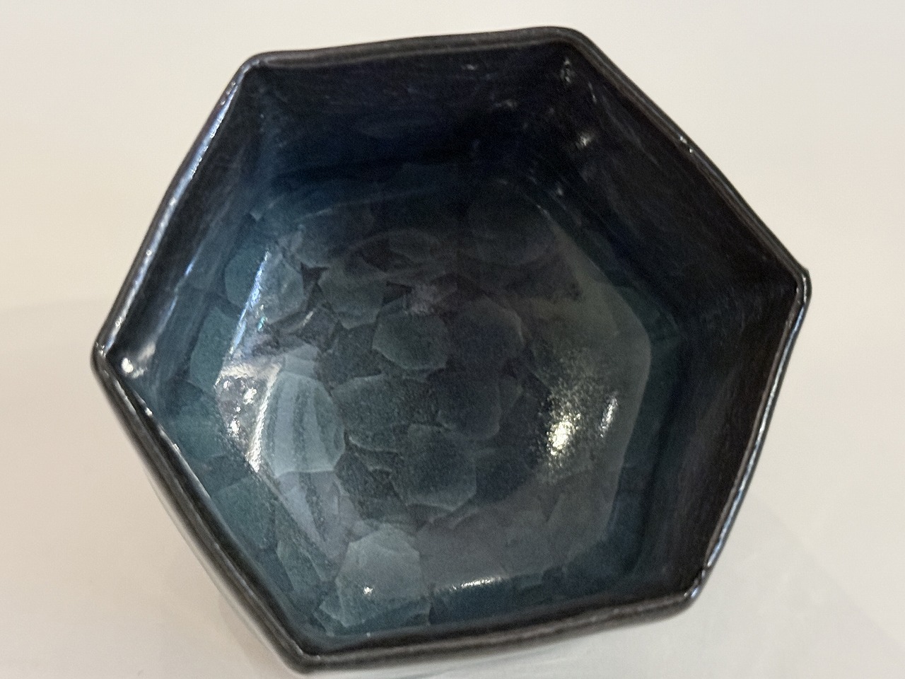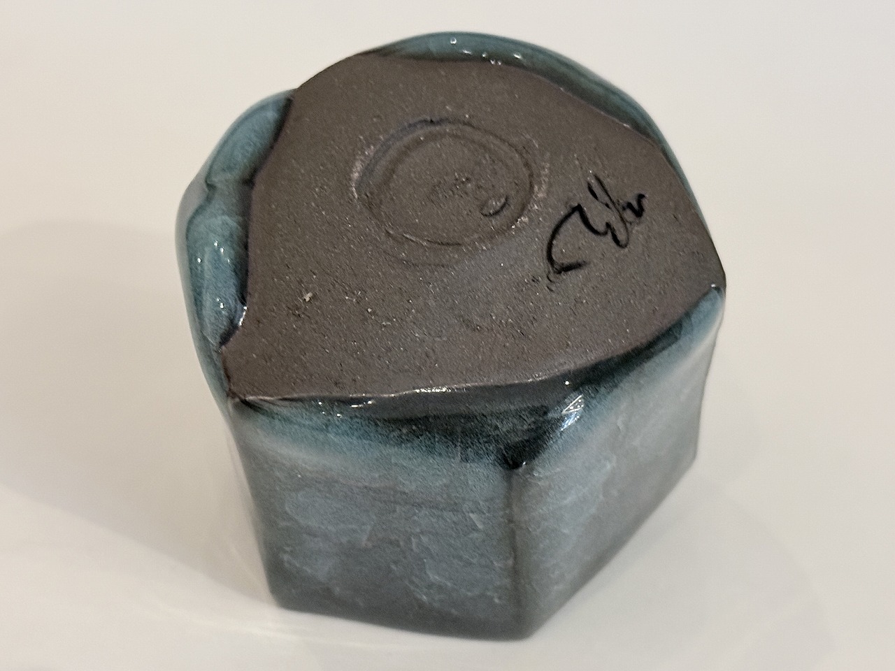 深みのある色調の青瓷作品は六角で収まりの良い逸品です