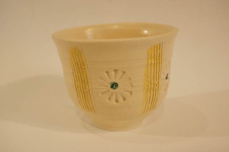 大振りで彫文と印花文に彩色を施した上品な華やかさを持つ器です